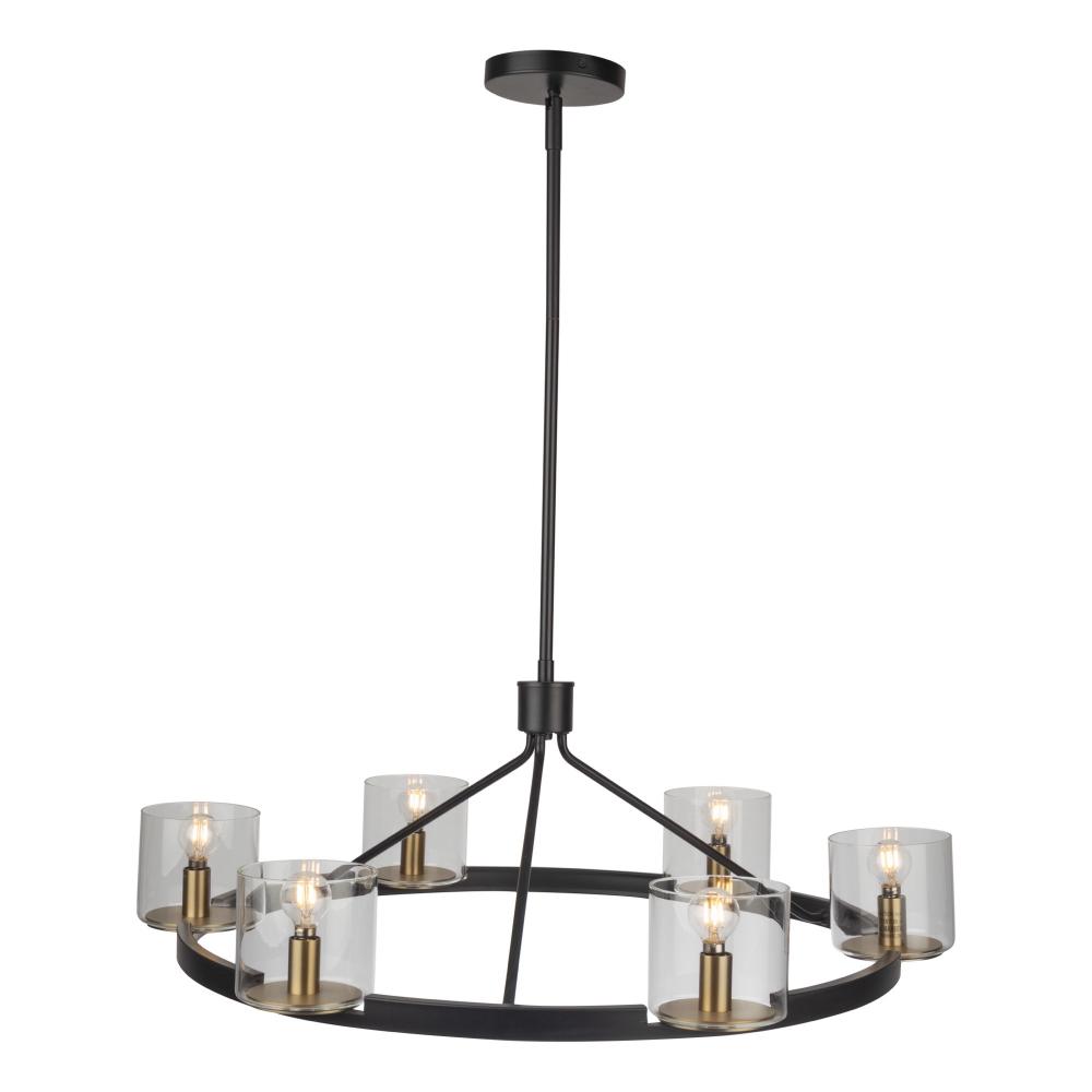 The Salinas Collection by designer Kevin Kraemer, has black frames complimented with brushed brass candles covered by clear cylinderical glassware. 6 light round chandelier model shown.