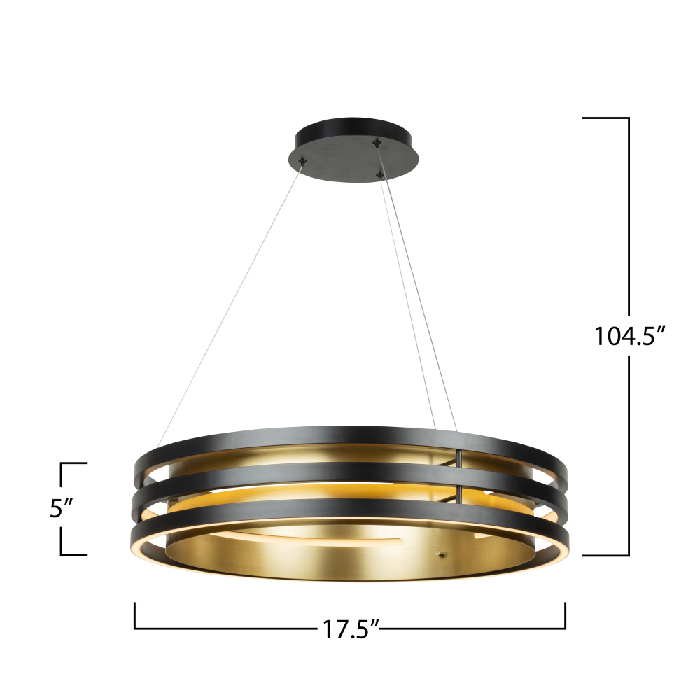 The Toledo collection by designer Kevin Kraemer boasts a striking 3-ring architecture. The outer ring is elegantly finished in black, and the inner is adorned in a lustrous brushed brass. This exquisite combination of contrasting colors creates a visually captivating chandeliers. Illuminated by energy-efficient LED - the bottom, middle, and top rings illuminate. This model has a switch to change the color temperature from 2700, 3500 and 4500 kelvin. The pushpin system allows for easy height adjustment. 17.5" diameter chandelier shown.