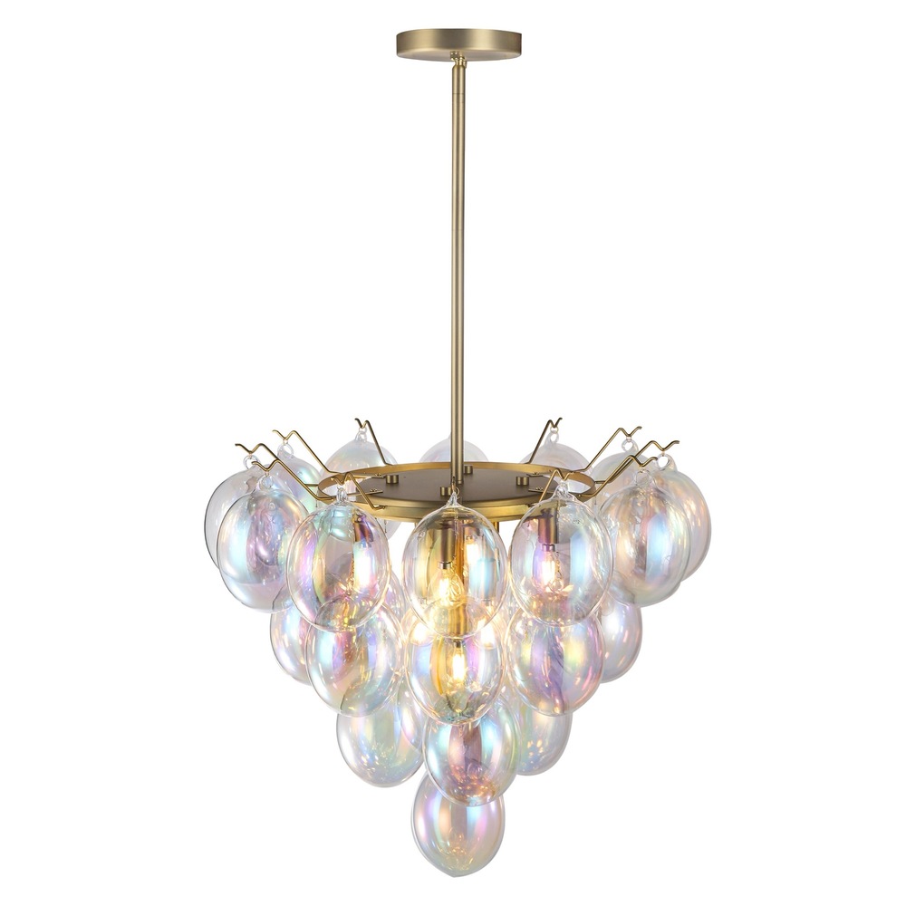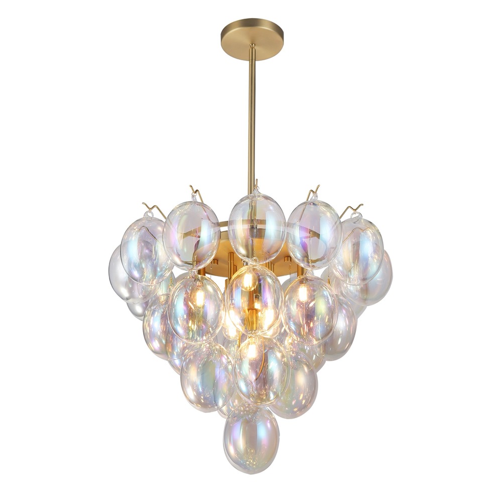 The Globo collection is characterized by its captivating iridescent floating bubble-type glassware, creating a mesmerizing and elegant rainbow visual effect. This unique glassware is compliment with brushed brass framing giving it a sense of warmth. With its harmonious blend of luminous aesthetics and refined materials, the Globo collection offers a distinctive and luxurious lighting solution for any space. 9 lite 4 tier chandelier shown. (height adjustable with included rods)