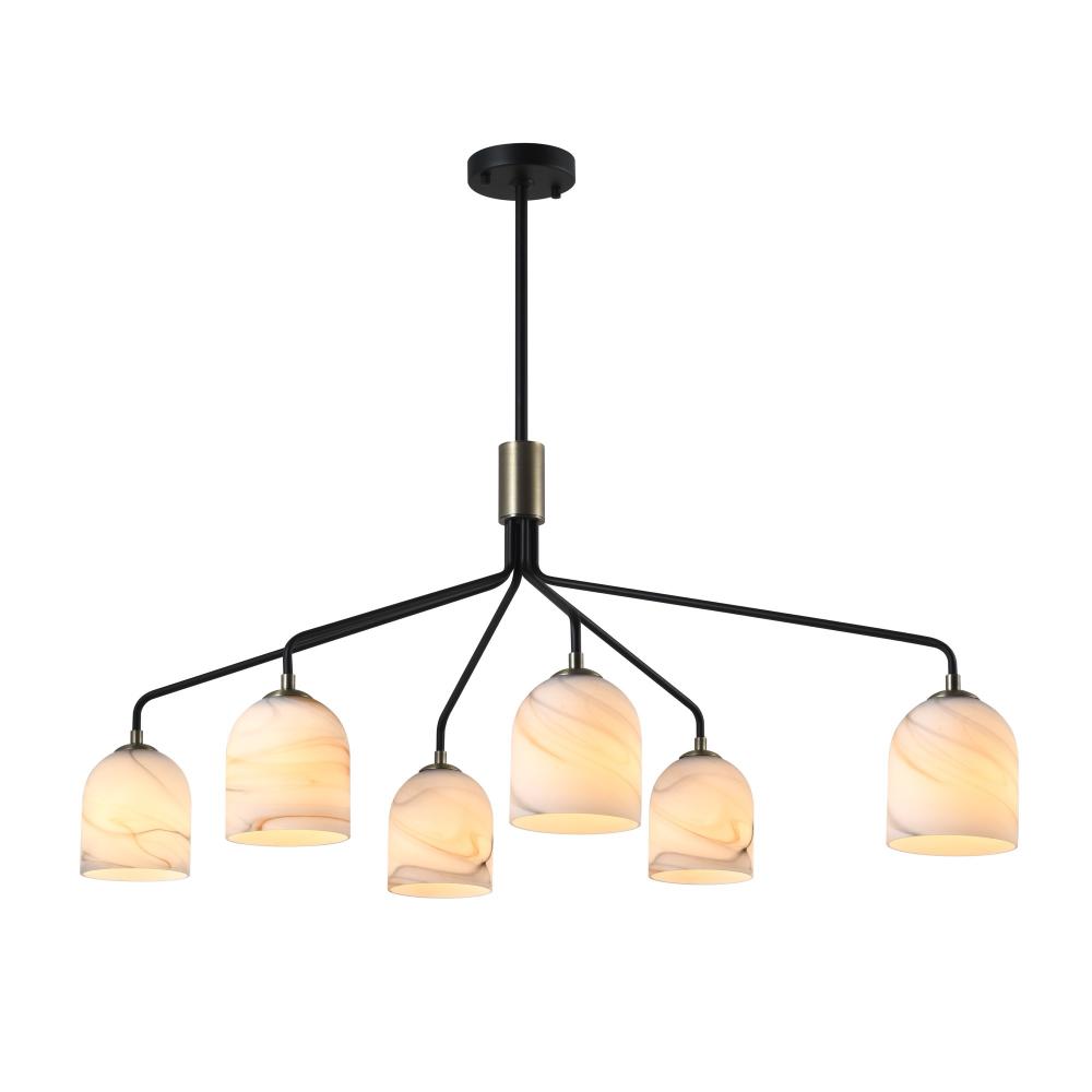 The Crema collection 6 light oval chandelier by Steven Sabados of S&C radiates understated sophistication with its alabaster-style swirl glass, casting a warm, inviting glow. Its sleek black frame is beautifully complemented by brushed brass accents, creating a perfect harmony of modern sophistication and classic charm. Rods included for easy height adjustment to suit different height requirements.