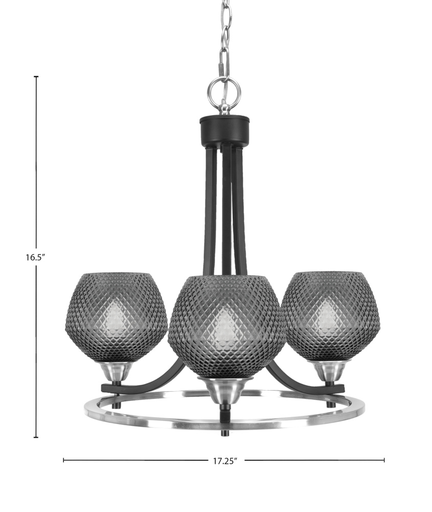 Paramount 3 Light Uplight Chandelier Shown In Matte Black & Brushed Nickel Finish With 6 Smoke Textured Glass