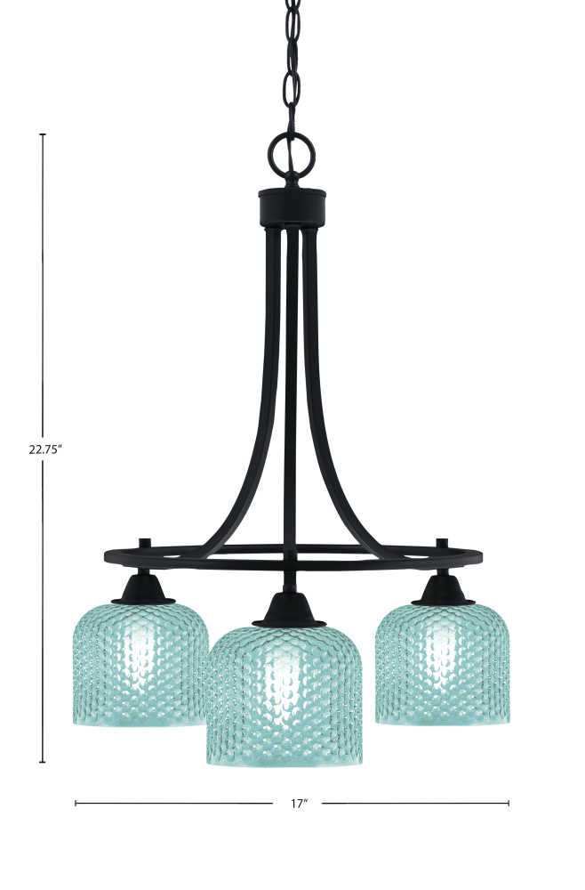 Paramount 3 Light Downlight Chandelier Shown In Matte Black Finish With 6 Turquoise Textured Glass