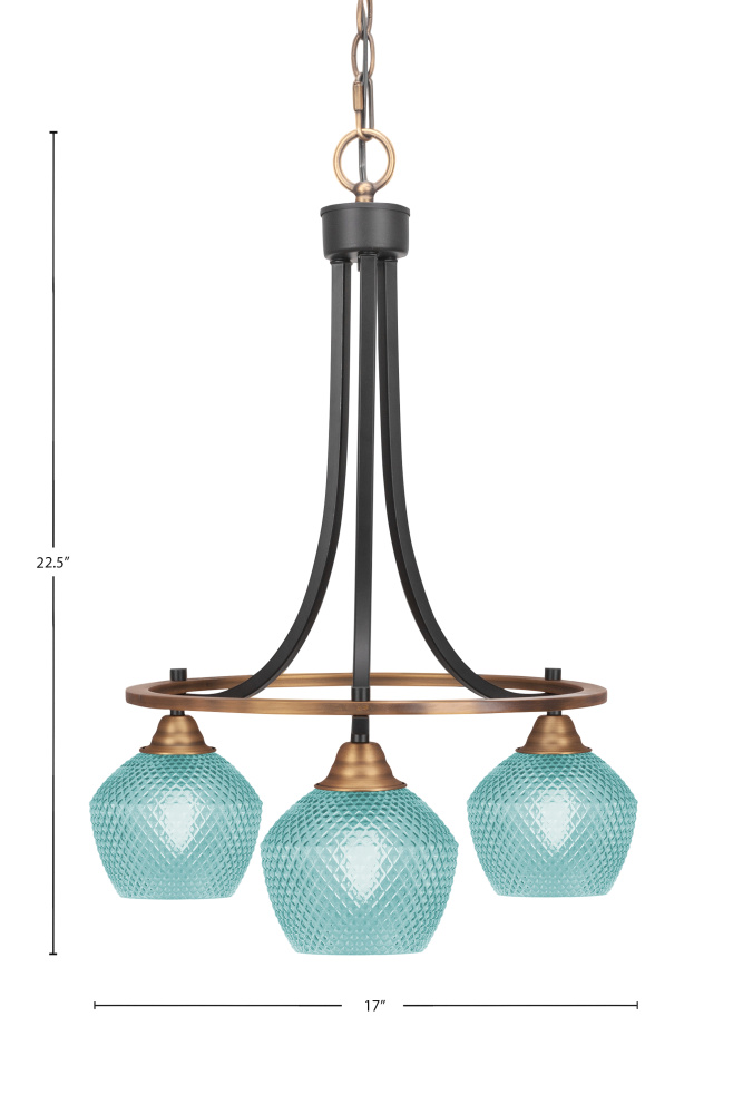 Paramount 3 Light Downlight Chandelier Shown In Matte Black & Brass Finish With 6 Turquoise Textured Glass