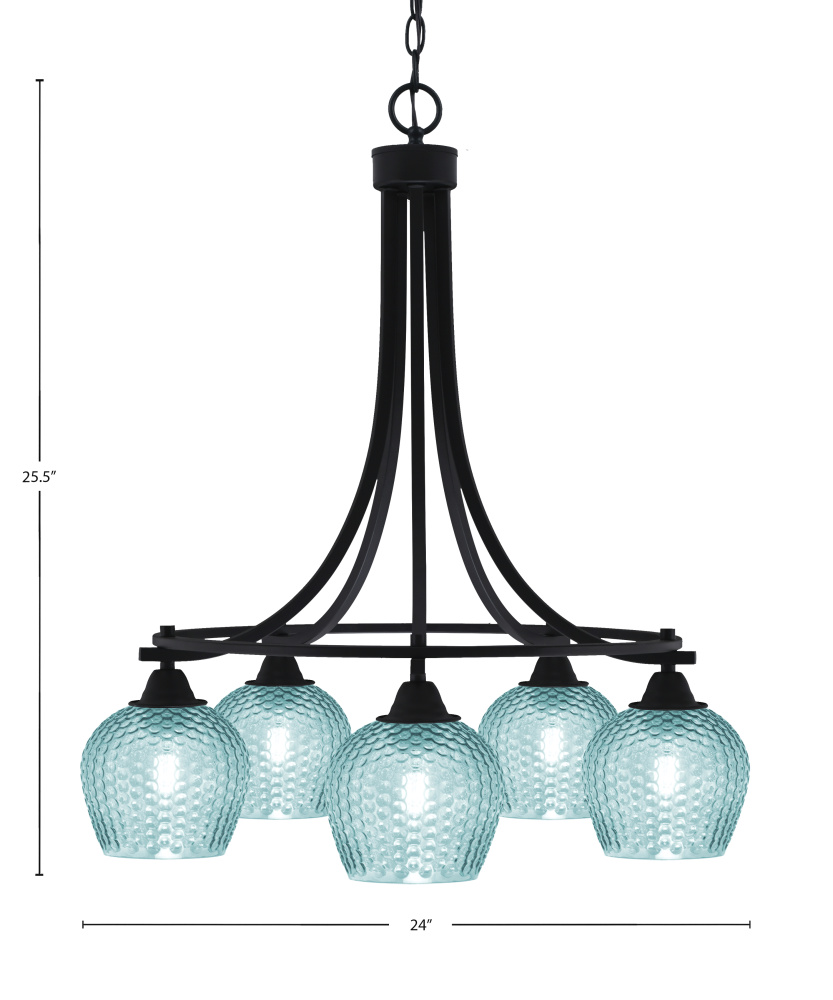Paramount 5 Light Downlight Chandelier Shown In Matte Black Finish With 6 Turquoise Textured Glass