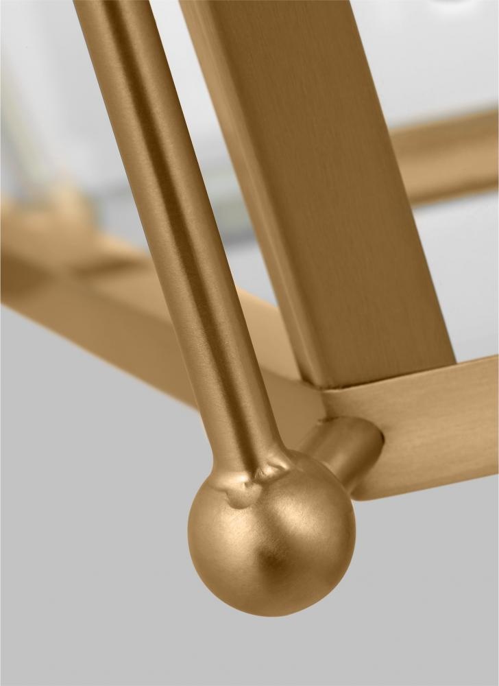 The Charleston four light indoor pendant in Satin Brass is crafted from metal, its frame is steeped in sophistication with an openwork silhouette accented by a curved top. Candelabra-inspired lights sit inside, highlighted by glass panels for a warm and even gleam.