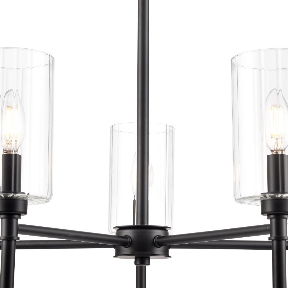 Combining classic 17th century style with crisp, contemporary appeal, the Chastine Family is the definition of refined elegance. Available as 1-light pendant, 5-light linear pendant, 1-light sconce, or 2-, 3-, or 4-light vanity, these gorgeous fixtures are available in modern gold, brushed nickel, polished nickel, or matte black. The luxurious detailing is further enhanced with stylized, clear ribbed glass shades, creating a truly sparkling effect perfect for any interior, from Art Deco to modern transitional.