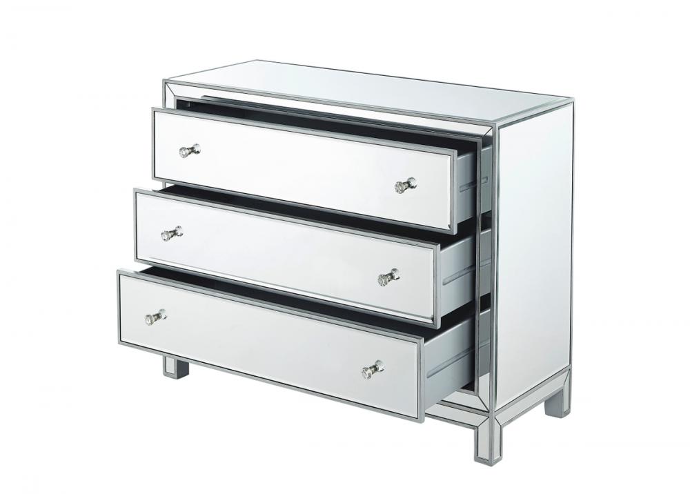 Striking a balance between elegance and functionality, this 40” wide cabinet is likely to be a perfect choice. It has three drawers with generous storage space, glamorous mirror surfaces, and stylish mitered corners. This contemporary chest with drawers is a perfect storage complement whether in your bedroom or any other room in your home. FEATURES: *Reflexion collection *3 large drawers * crystal knobs *Hand paintedSilver finish *Beveled mirror panel *Solid wood trim and legs *Wood drawer glides *Inside lining painted in silver. PRODUCT DETAILS: Measurement W40xD16xH32” *No assembly required *Material in solid wood and engineered wood *1 year limited warranty.