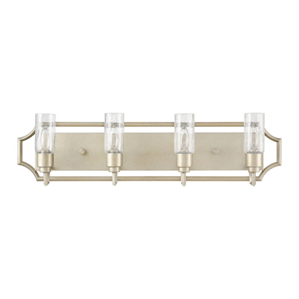The Cheswick vanity collection showcases a crackled glass cylinder arranged within a geometric framework. The crackled glass diffuses the light which is softened further by the aged silver finish.
