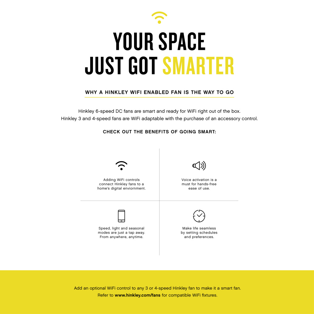 Built with a sleek, carefully crafted design, Chisel redefines dramatic style. Sturdy solid wood blades are available in a variety of sophisticated finishes to complement modern interiors and outdoor settings. Damp rated. Equipped with a 6-speed DC motor that is WiFi enabled and ready to connect right out of the box. Operated by the HIRO control or WiFi compatible with the Hinkley App.
