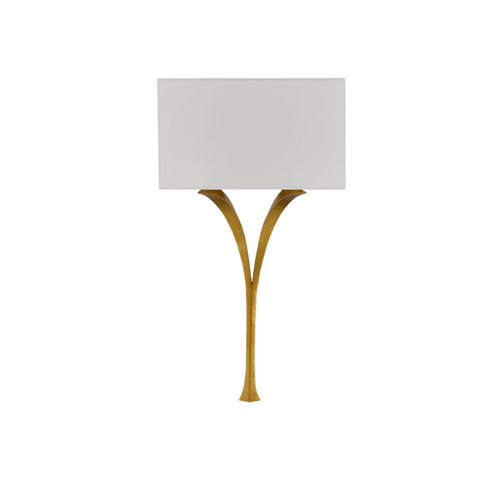The delicately beautiful Choisy Wall Sconce is made of wrought iron in an antique gold leaf finish. The winsome curve of the wishbone shape and the slight flare at the bottom bring this gold sconce gracefulness. The sconce is fitted with a rectangular white linen shade.