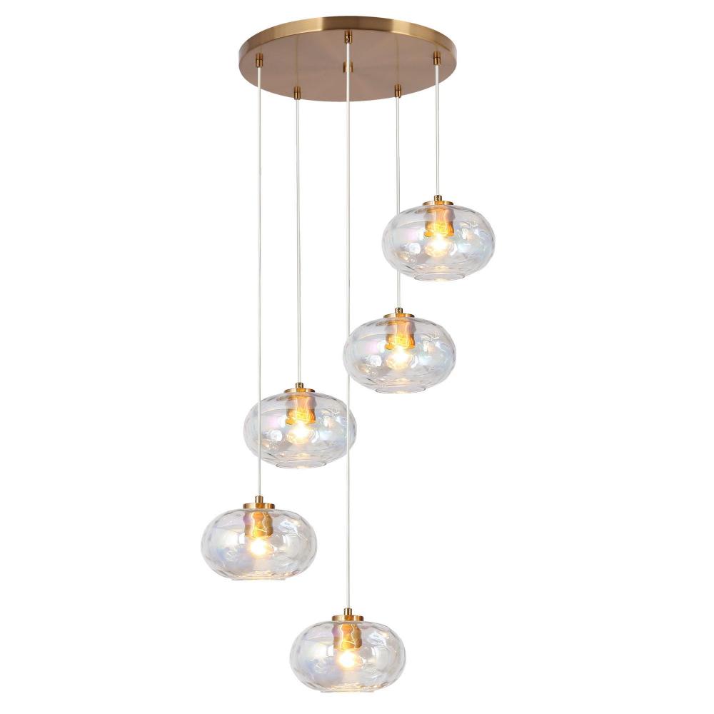 Featuring masterfully hand-worked pressed glass with a rippled texture, this collection offers a forged look. Sophisticated brass plating and curvilinear jar shades relax the design’s angles, adding elegance.