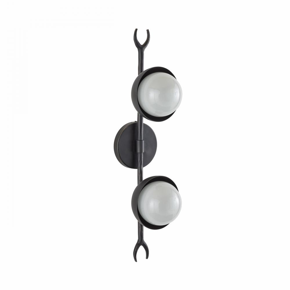 Arms and armory inform the sharp angles of our spear-like sconce. Designed to be hung vertically or horizontally, the hammered blackened iron backplate extends to gently cup double globes of frosted glass. Finish will vary.