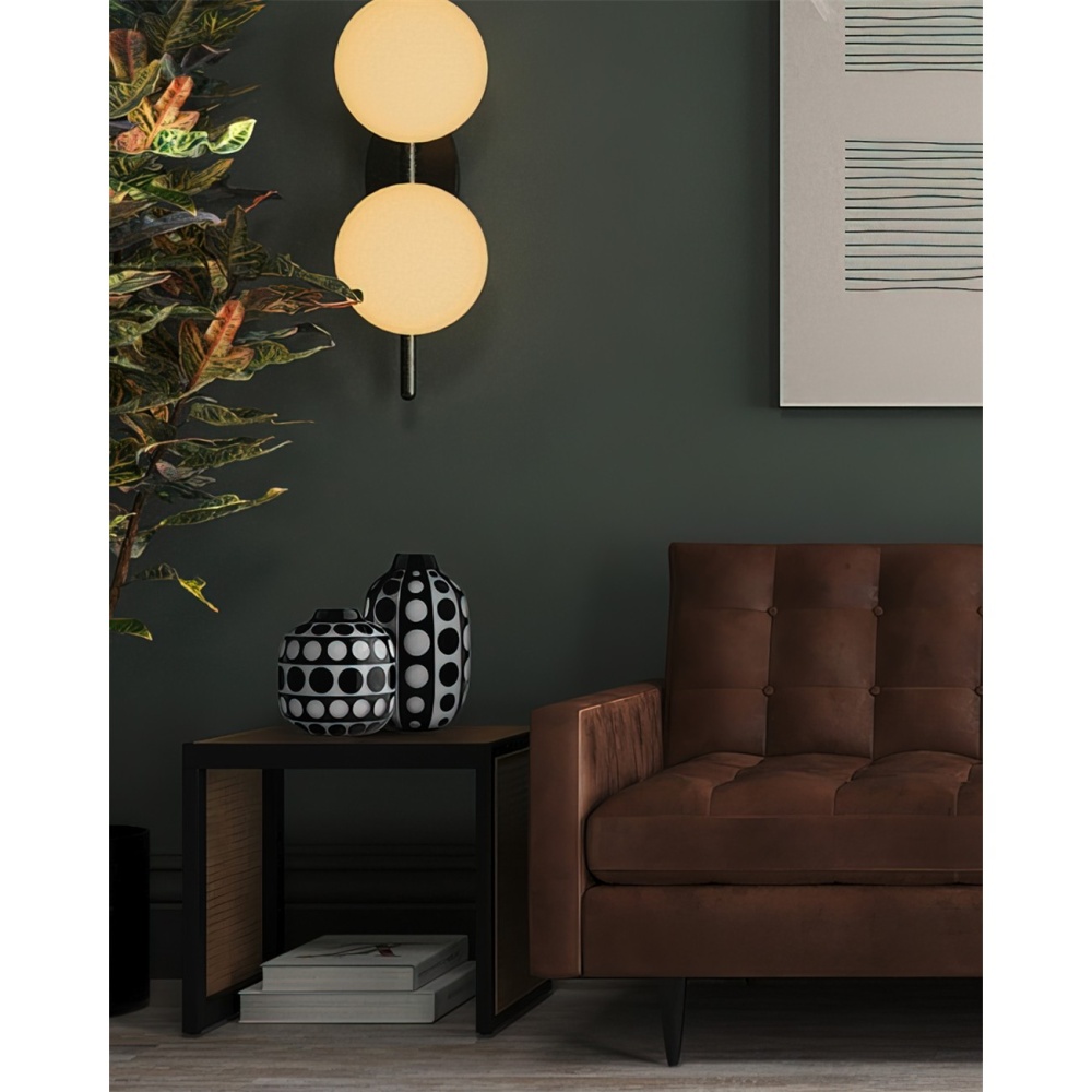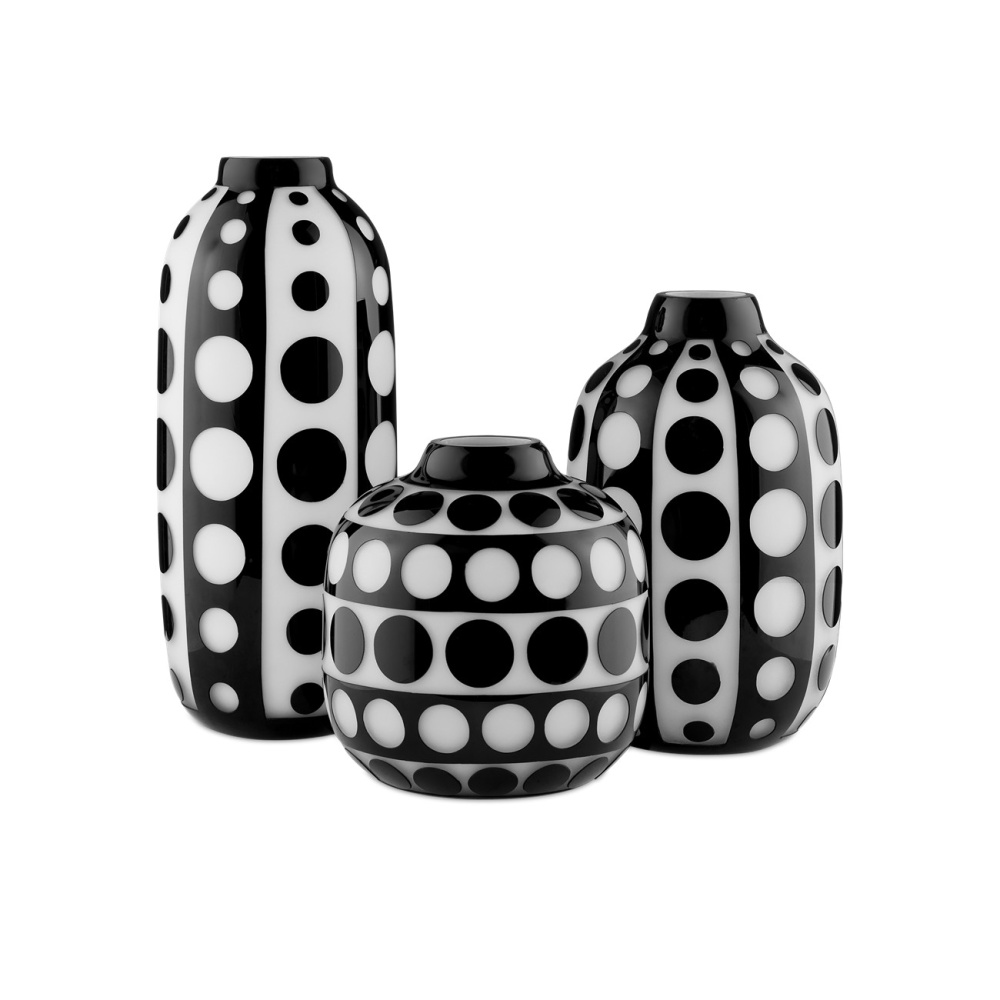 The Cicero Medium Black & White Vase was created by an intensively complex process of layering clear, black, and white glass in that order. The dynamic profile with its mod geometric surface swirls with personality. Because the glass is layered on, there are slight raised areas that can be felt. This and the fact that the white layer of glass has to be sand-blasted away to reveal the black layer illustrates the artisanal quality of the white and black vase.