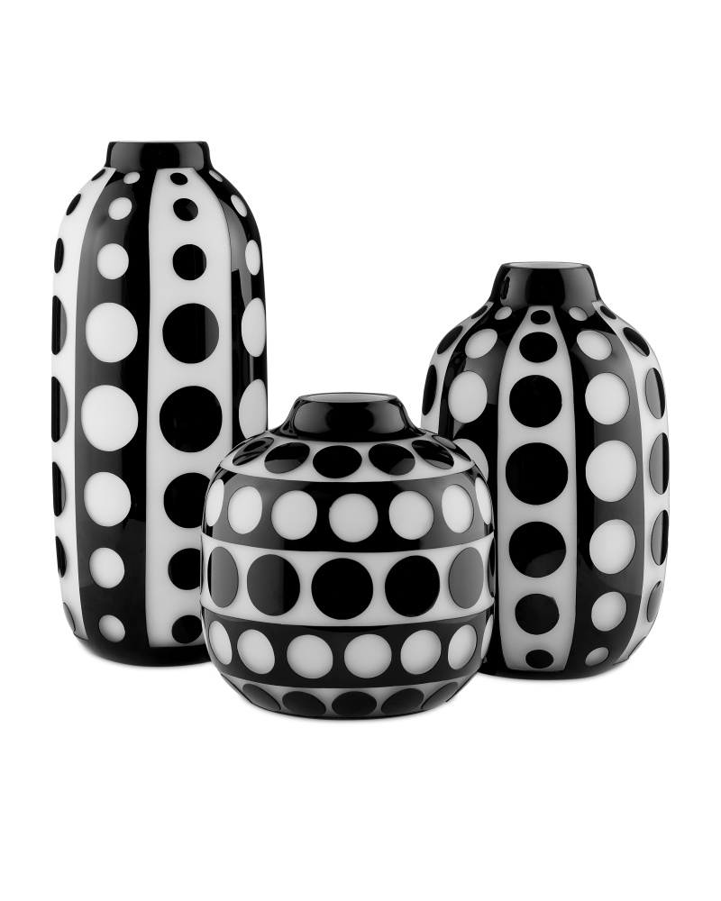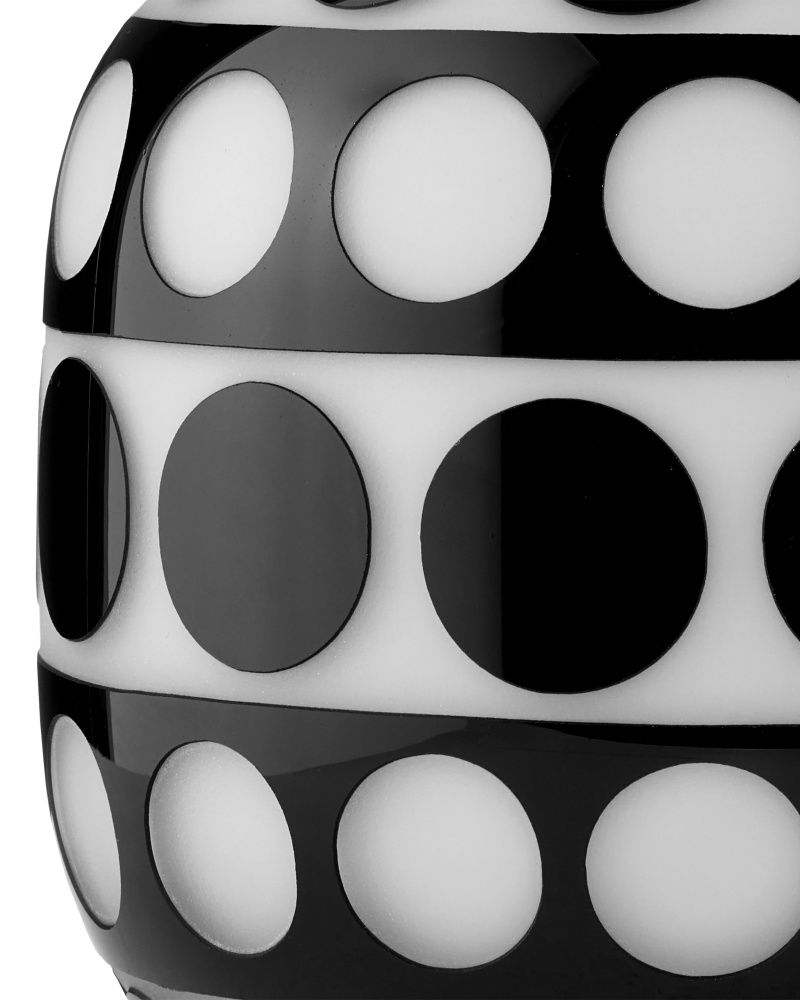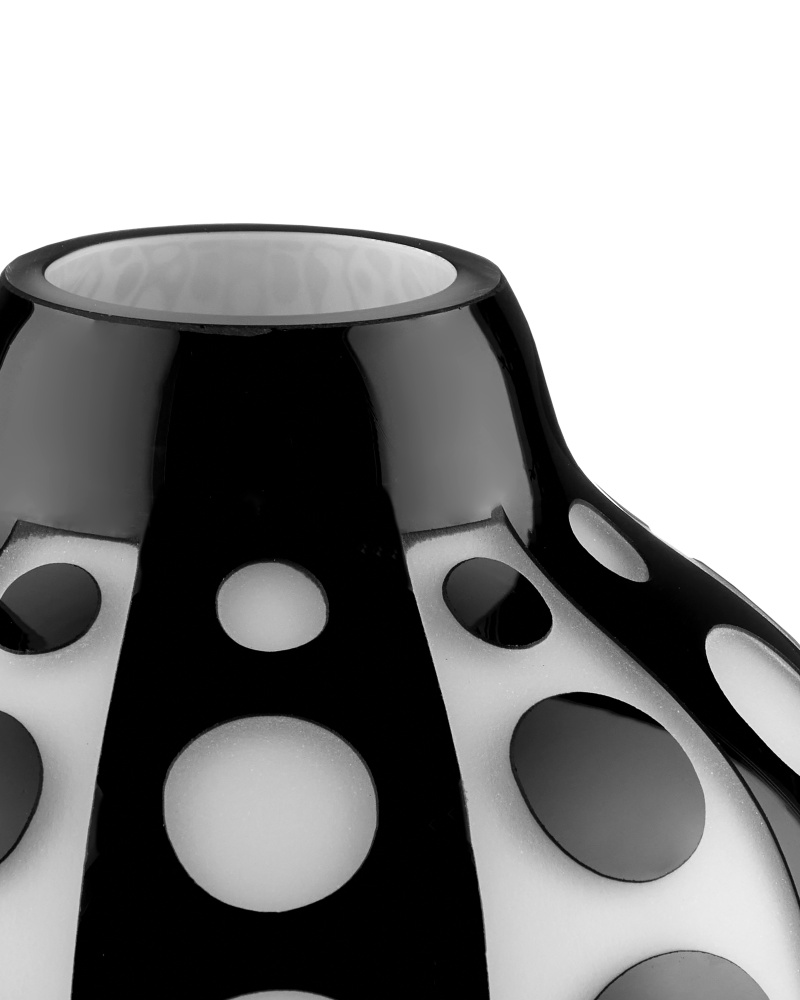 The Cicero Small Black & White Vase was created through an intensively complex process of layering clear, black, and white glass in that order. The dynamic profile with its mod geometric surface swirls with personality. Because the glass is layered on, there are slight raised areas that can be felt. This and the fact that the white layer of glass has to be sand-blasted away to reveal the black layer illustrates the artisanal quality of the white and black vase.