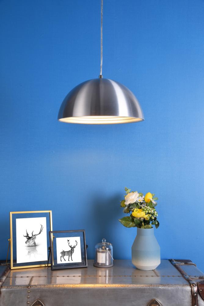 The hemispherical burnished nickel aluminum shade easily adapts to any decor
