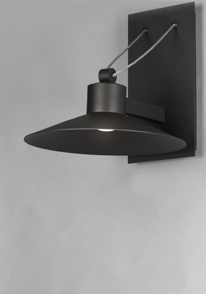Conical shades finished in Architectural Bronze appear to be suspended by its stainless steel cable. Concealed inside these shades is a high powered COB LED which shines into a heavy Clear glass font. The bottom of theses fonts have an additional thickness