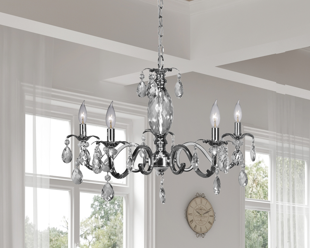Our Clara 5 LT Crystal Chandelier adds instant opulence to any room in your home. This dazzling fixture features a metal base that is finished in glistening chrome. A large faceted crystal oval around the center column touts a crosshatch pattern that will sparkle brightly when the chandelier is illuminated. Just under, a solid crystal disk is topped by a metal column break that is finished to match in chrome. 5 beautifully scrolled arms extend outward from the fount; each is topped with a faceted crystal candle cup and an open candelabra base and is adorned with a ring of crystal-beaded chain that features a large faceted crystal prism at the bottom. At the top of the chandelier, a metal vase cap is cast in a floral motif and is adorned with more crystal prisms for even more sparkle and drama. The fixture hangs from a metal ceiling canopy and chain that are finished to match in sleek Chrome. Our Clara 5 LT Crystal Chandelier is a dramatic way to light a formal dining area that also makes a very regal statement when used in a foyer or as a whole room light in rooms with higher ceilings.