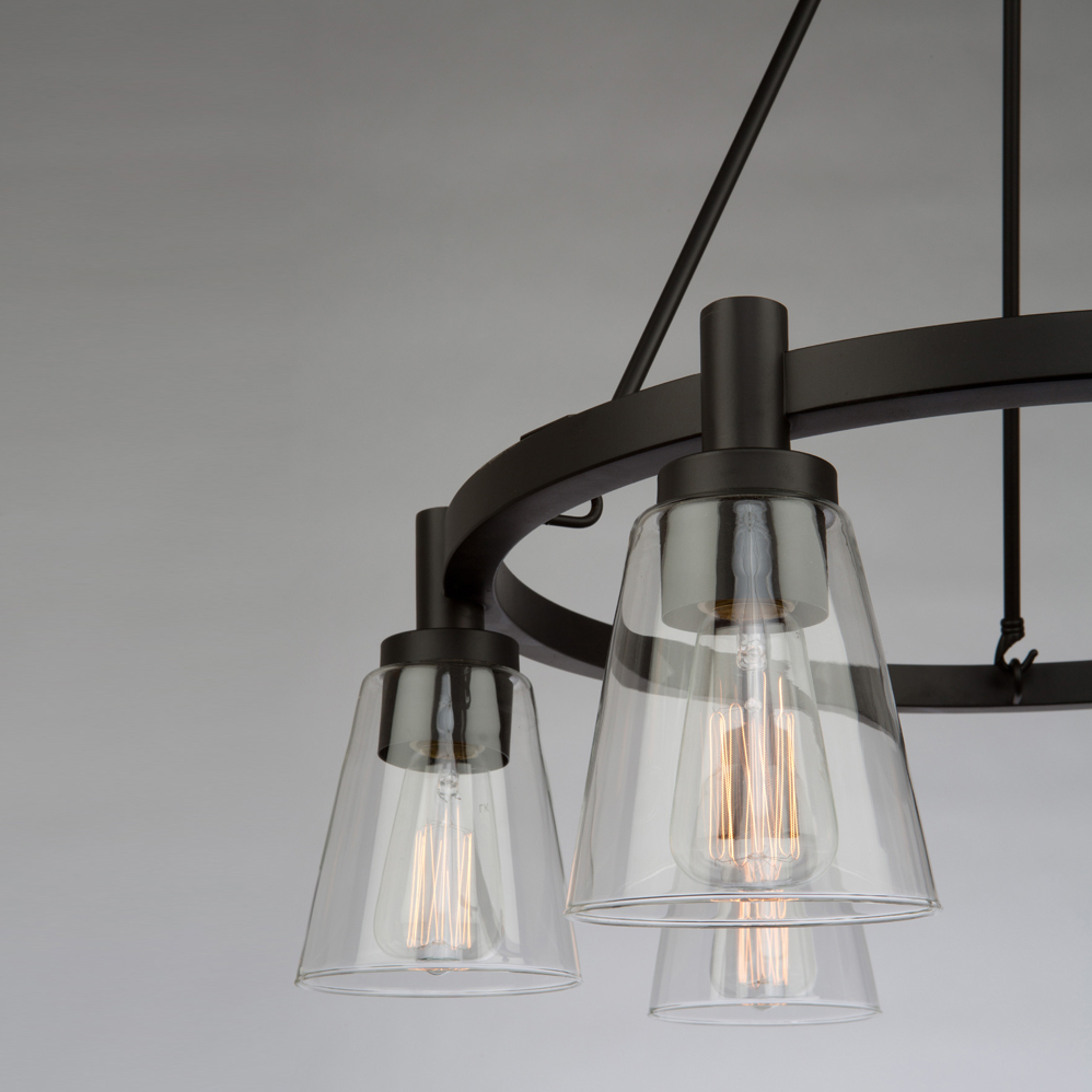 The "Clarence" collection is comprised of a rich oil rubbed bronze finish that ties up with clear cone shaped glassware. Shown with retro type Edison bulbs for maximum aesthetic beauty. Also available in plated brushed nickel version. Six light single tier down model shown