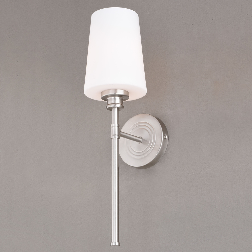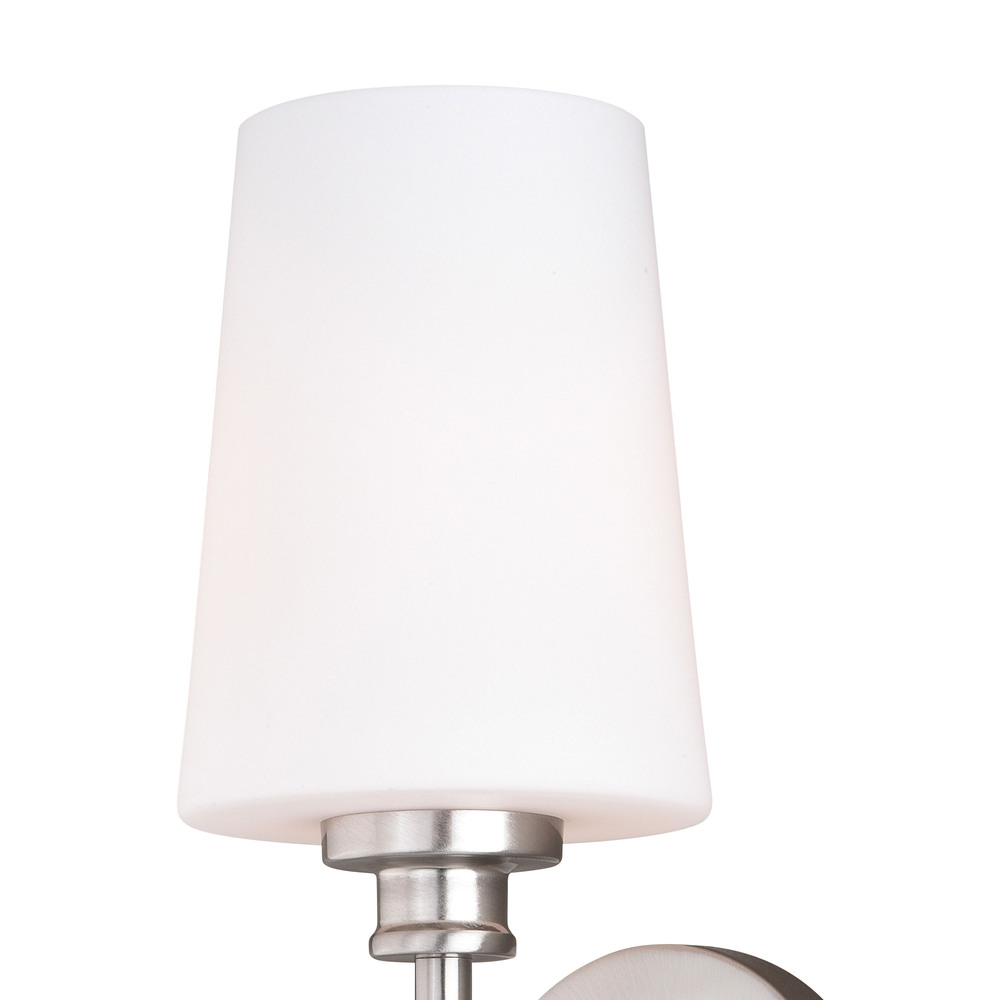 Classic styling and elegance come together in perfect harmony with the Clark collection. The smooth nickel finish provides balance to the frosted opal glass shade. This wall sconce is ideal for bathrooms, hallways, stairways, foyers, and more.