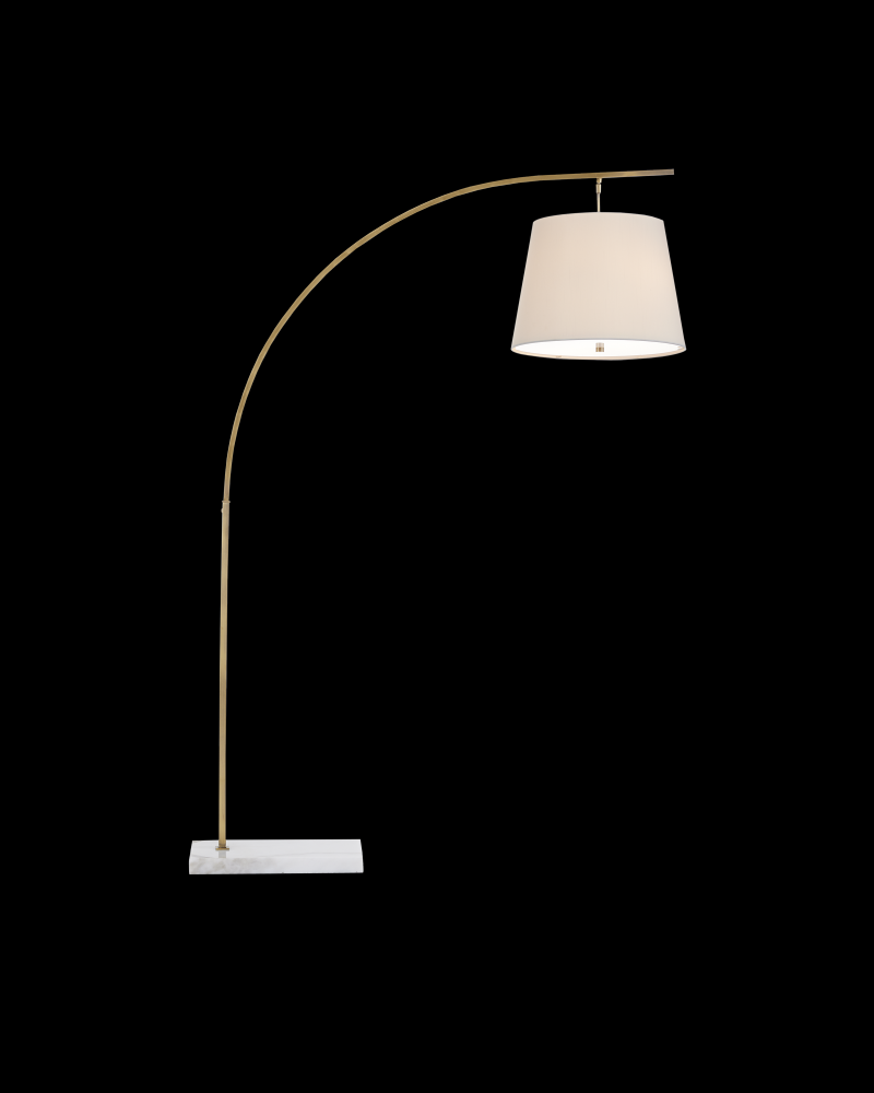 The angular arc of the stem of the Cloister Brass Floor Lamp, the way the shade dangles, and the minimal shape of its base makes it an exemplar of contemporary design. The clean way the stem is fastened to the base and the pared-down lines of the white linen shade enhance the gold floor lamp's modernity. The acrylic diffuser fastened by the petite button finial is a design detail of note.