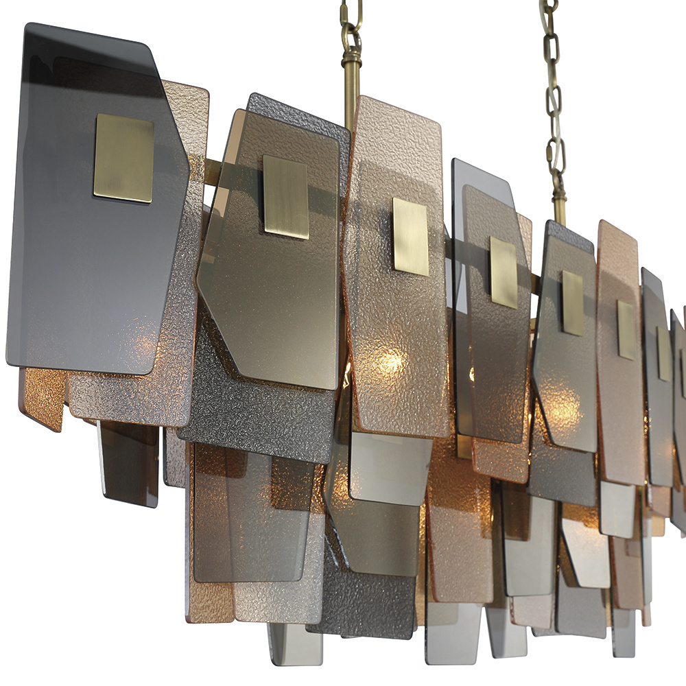 Hand-cut, naturally colored glass in the Cocolina collection creates one-of-a-kind pieces. Because of its natural tinting process, the colors are not all exact, providing a range of smoke and amber hues which further adds to its uniqueness. With its intricate detailing of the hand-pressed glass, the light emits a captivating warmth from within.