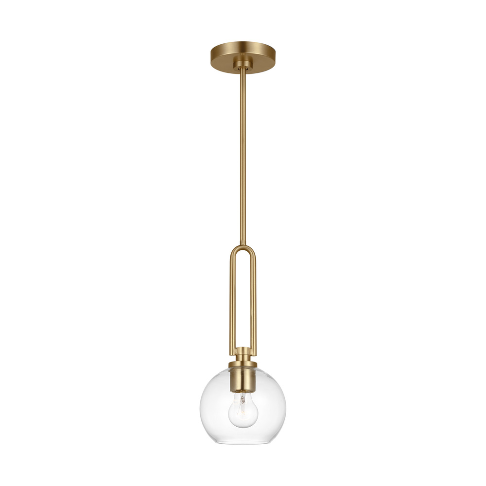 The Codyn one light mini pendant in Satin Brass is a contemporary take on a classic mid-century design. Clear glass shades with open-ended spheres accent the elongated keyhole strap detail, for a clean look. This minimalist collection relies on subtle details to create visual interest