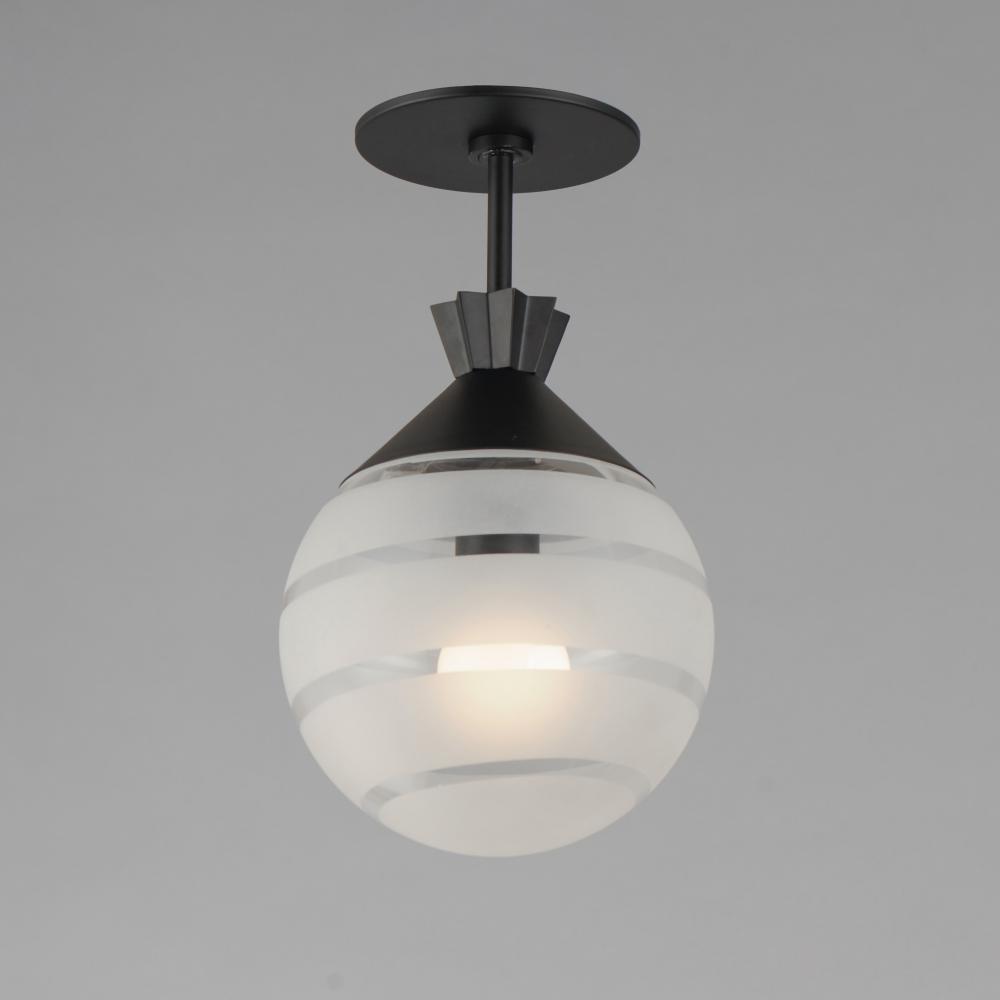A playful grouping of globe and tapered cylinder glass shades feature a distinctive striped pattern as they are held from crown-like fonts. Spiritedly vintage and excitingly modern, this fashionable series of outdoor rated sconces and pendants connects sty