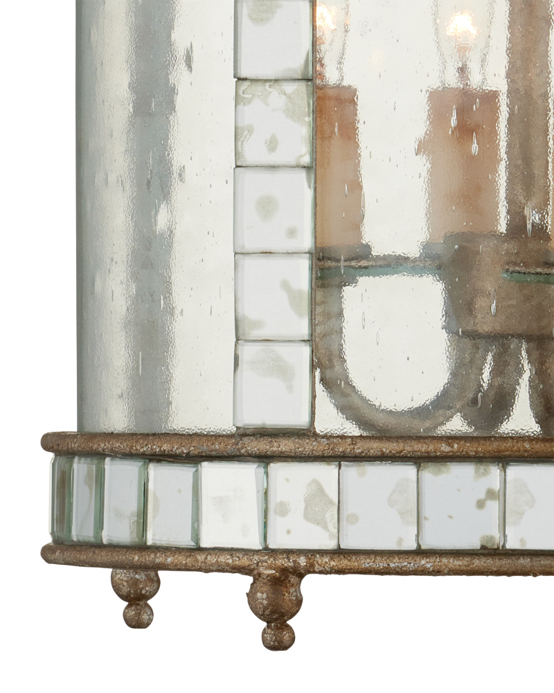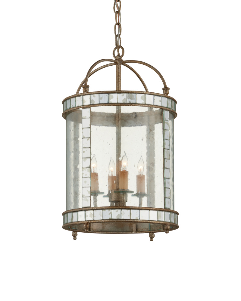 This jewel-box of a lantern will outshine any other baubles in a space, and maybe its own illumination, thanks to the inlaid squares of antiqued mirror and antiqued silver leaf finish composing the frame. Adding to the charm of the small version of the Corsica Lantern are curved seeded glass panels that encase the illumination. The four-light fixture measures 13 inches in diameter by 21 inches high.
