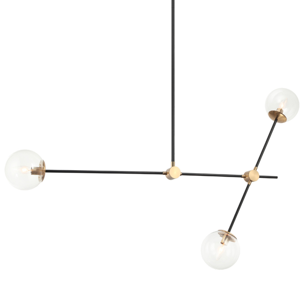 Cosmic is arranged with long, sleek, black slidable rods, paired with Aged Gold Brass finish details.This collection is available in 2 sizes in either Clear or Opal glass to provide a stunning yet minimalistic look.The creativity of this series adds a unique detail to any space.
