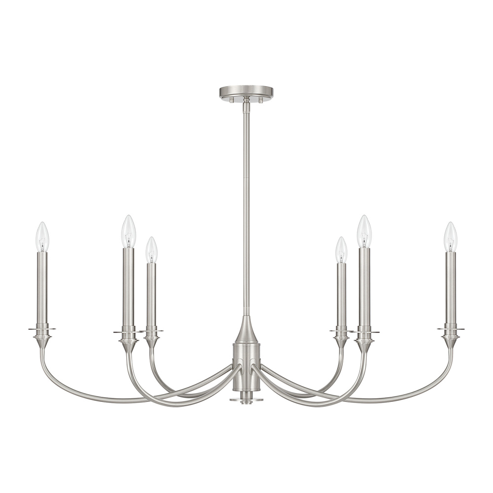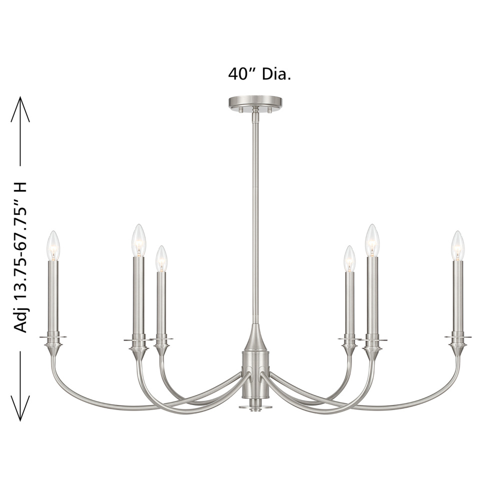 The Savoy House Coventry 6-light chandelier offers a refreshing take on classic style with curving arms and tall candle covers that gleam thanks to the cool sheen of a Satin Nickel finish. This finish gives the chandelier a refined luminosity, making it an elegant choice for spaces that call for brightness without excess warmth. Coventry is 40" in width and features an adjustable height from 18.75" to 60.75". It uses six candelabra size bulbs of up to 60 watts each (not included) and comes with four 12" downrods and one 6" downrod.