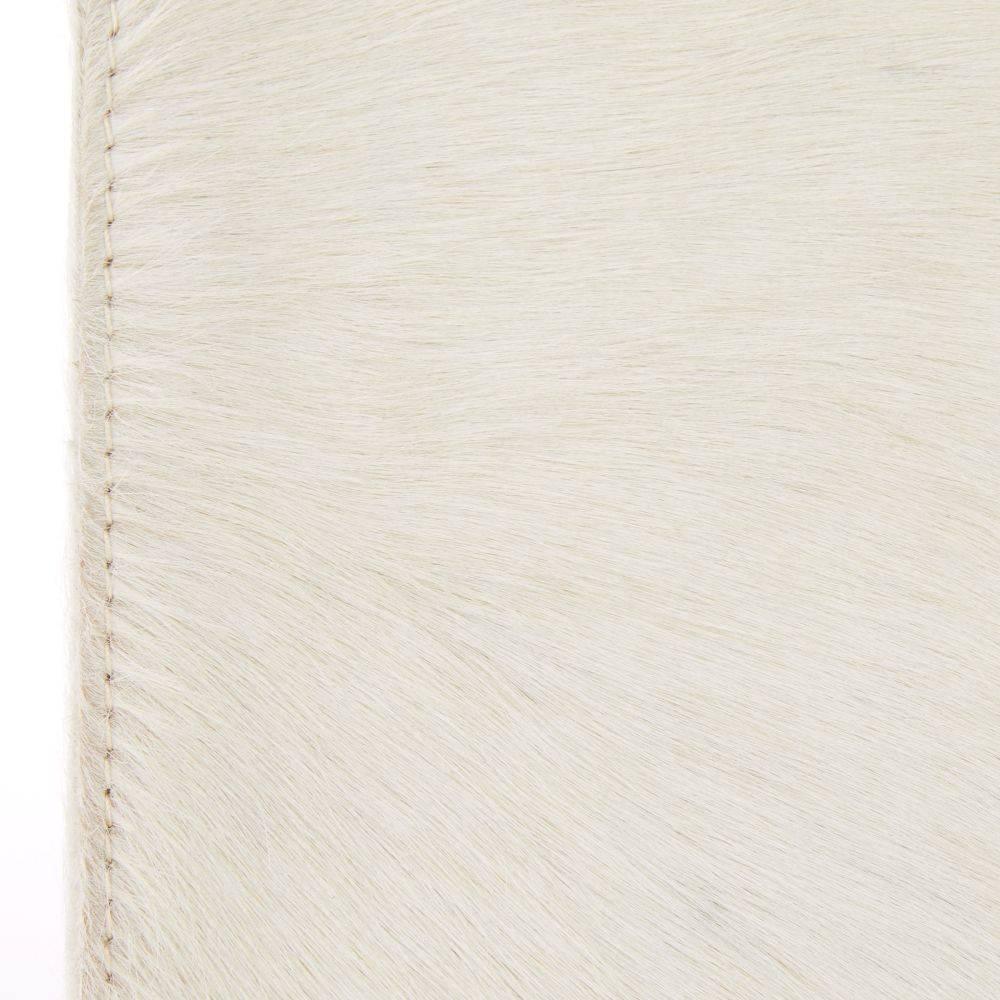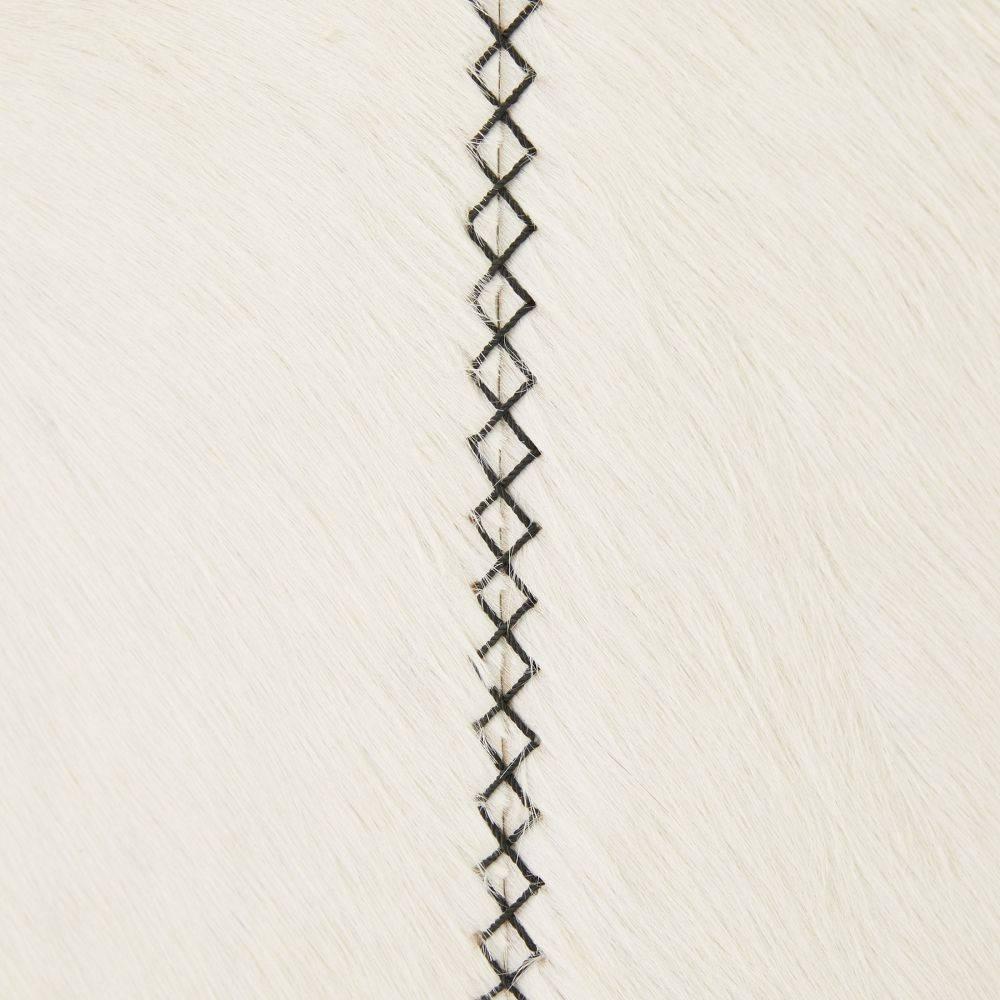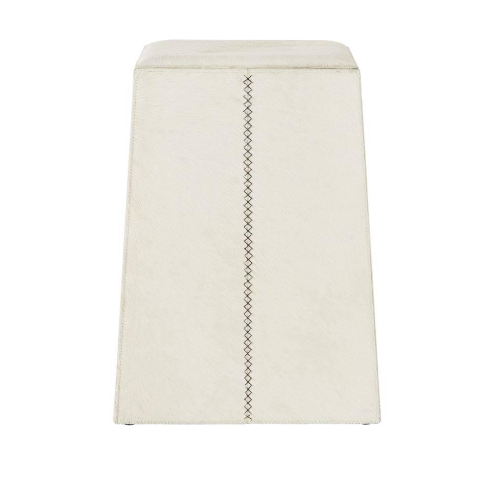 Crafted of white hair-on-hide, this backless counter stool is a tactile delight. A mitered whipstitch creates a racing stripe down the center of each side, while slim antique brass bridges add contrast and support to this minimal design. Hide will vary.