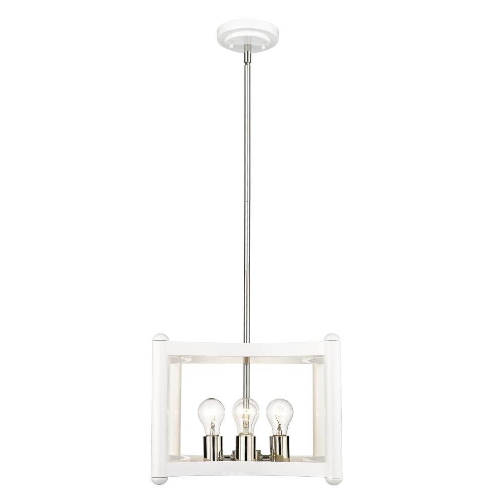 Classic, coastal design. Try gouping in multiples over an island or dining table for a wow effect. Unique finish combination using a White frame, accented with a shiny Nickel cluster and candle sleeves.