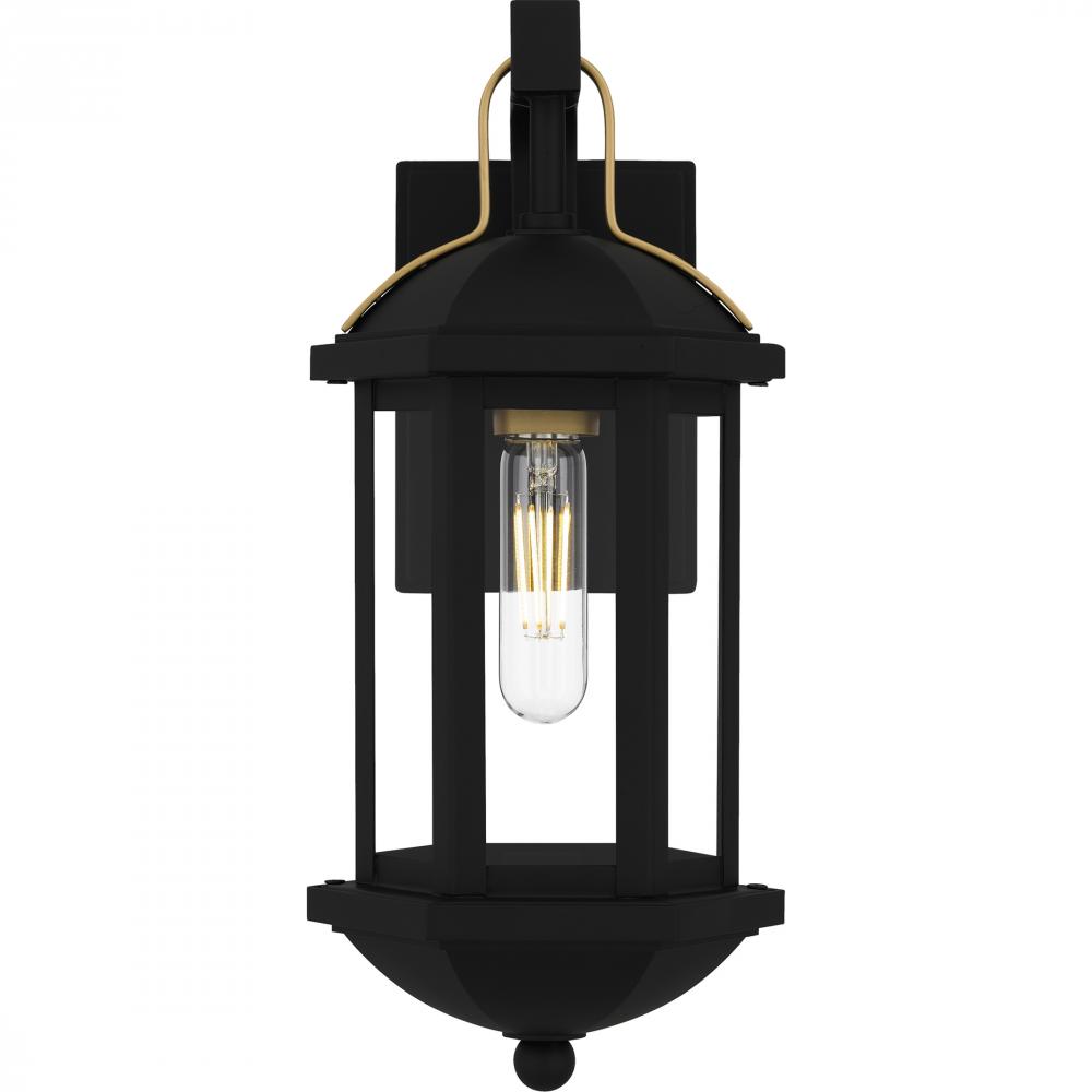 Illuminate your homes exterior with the timeless style of Crestfield lanterns. The elongated frame is finished in matte black and accented beautifully with brushed gold for a hint of luster and sophistication. Clear tempered glass panels complete the look