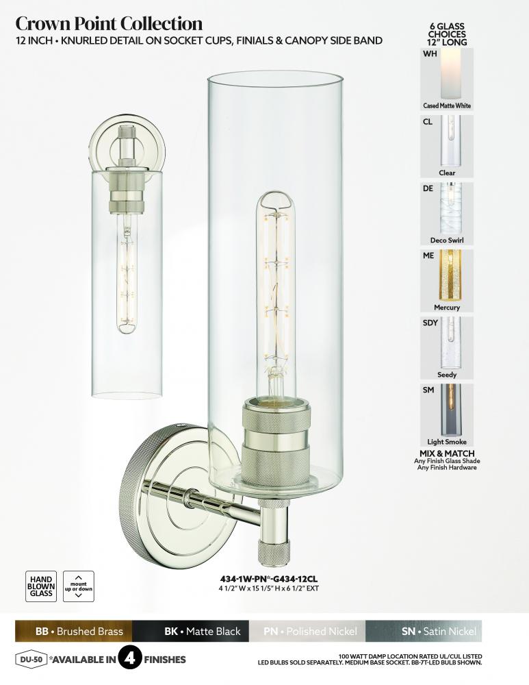 Details abound in the Crown Point Collection with an industrial take on modern sophistication. This stunning line of fixtures features cylindrical glass set in an updated restoration style frame with intricate knurling detail on the sockets, canopy, and fi