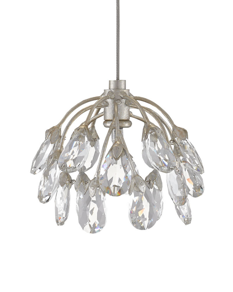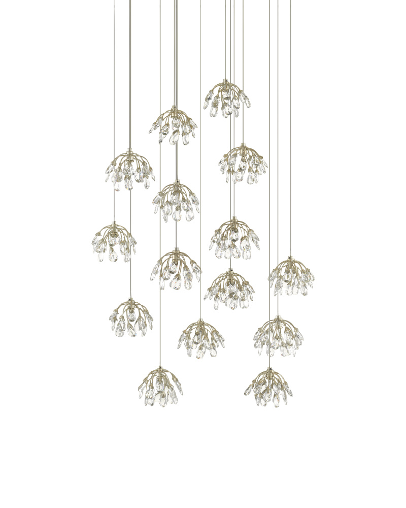 The Crystal Bud Round 15-Light Multi-Drop Pendant dangles flowers made of delicate faceted crystals from its canopy to make the shades effervescent and graceful. The canopy of this piece is luminous in a painted silver finish. This fixture is among Currey & Company's multi-drop pendant collection, which includes multiple configurations.