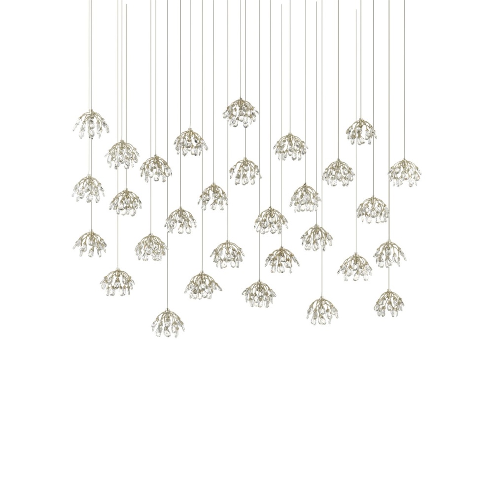 The Crystal Bud 30-Light Multi-Drop Pendant dangles flowers made of delicate faceted crystals from its canopy to make the shades effervescent and graceful. The canopy of this piece is luminous in a painted silver finish. This fixture is among Currey & Company's multi-drop pendant collection, which includes multiple configurations.