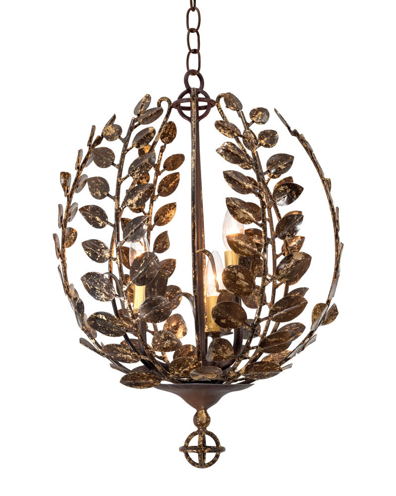 Cluster Chandelier of Small Athena Lanterns Hanging from hand forged iron medallion. Lanterns are 24" tall x 24" wide. Entire Cluster is 5' wide x 12' tall. Lanterns highlighted with gold leafing and hangs from our deco chain #1.