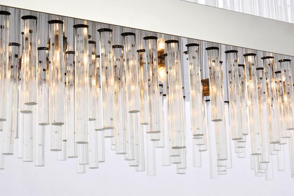 This stately fixture combines timeless elegance with modern and attractive sophistication. The delicate juxtaposition of upright and hanging clear glass rods creates a truly stunning visual statement, seamlessly woven together within a sleek bold metal frame. This expressive piece would be a welcomed and treasured addition to a wide range of modern residential styles.