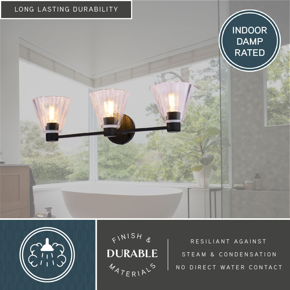Elevate your daily routine with the Dalton 23-inch vanity light. Featuring three beautifully crafted fluted glass shades and a sleek matte black finish, this wall fixture adds a touch of modern elegance to your bathroom. The classic, timeless silhouette complements both contemporary and transitional interiors, creating a spa-like atmosphere in your own home. It's the perfect way to brighten your space and start your day in style.