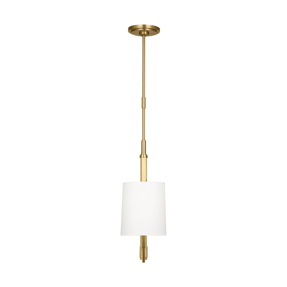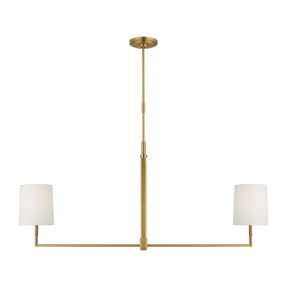 Crafted with Steel in a Burnished Brass finish with white linen fabric shades