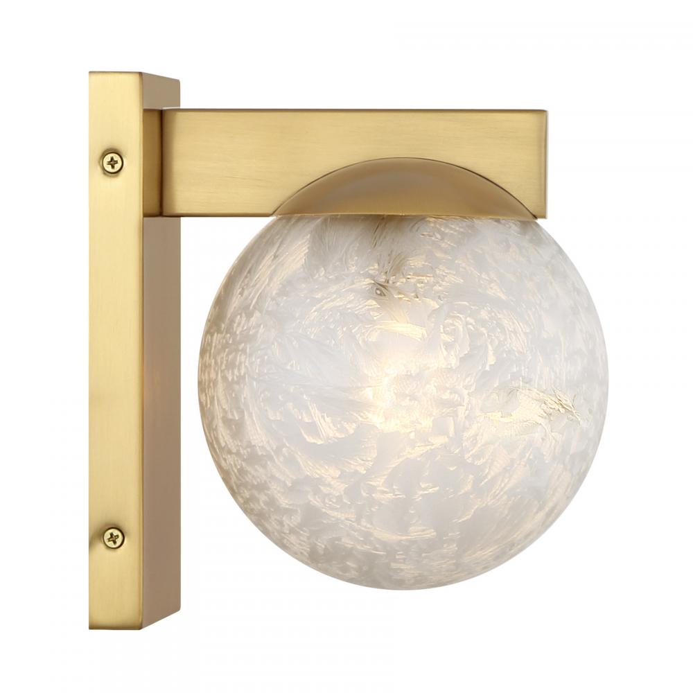 The Savoy House Darien is a 1-light sconce with fabulously chilly appeal. A minimal frame is finished in bold Warm Brass and holds an orb of Ice Glass, adding sub-zero cool with tons of frosty texture. Darien is 7.88" in height, 5.88" in width and extends 7.25" from the wall. Uses one candelabra size bulb of up to 60 watts. Bulb not included. This sconce is damp area rated.