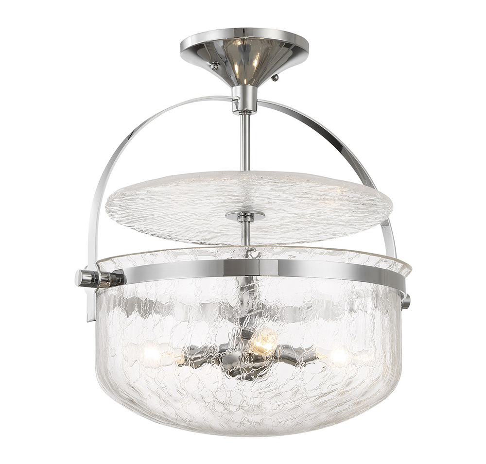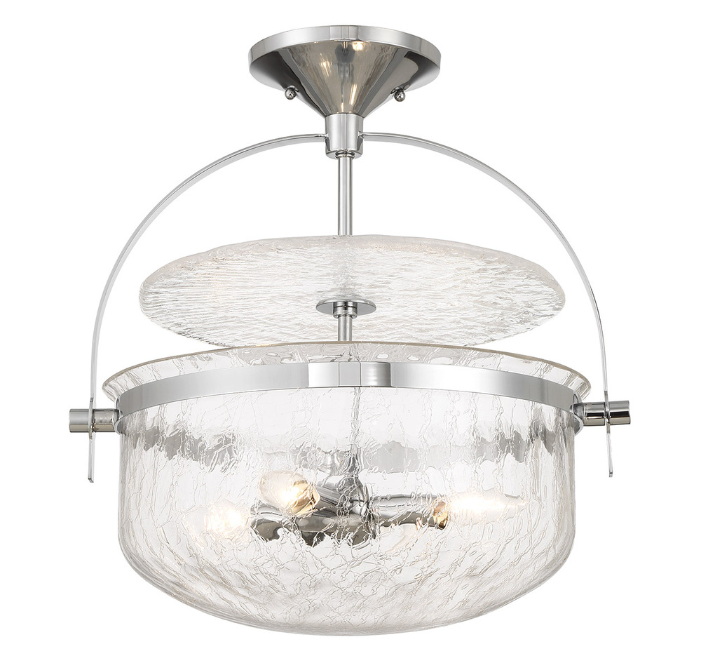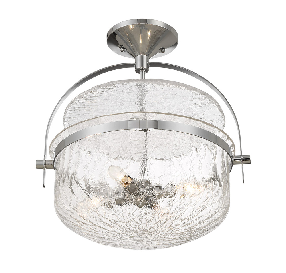 The Savoy House Denmar 4-light convertible semi-flush mount perfectly illuminates a wide variety of spaces with its classic style. It also has superior versatility because it can be used as a hanging pendant or ceiling light! The shade and diffuser of crackled glass bring eye-catching texture while the Chrome finish adds sleekness. Denmar is 18" in width and has an adjustable height ranging from 19" to 73". Comes with four 12" downrods and one 6" downrod. Uses four candelabra size bulbs of up to 60 watts per bulb. Bulbs not included.
