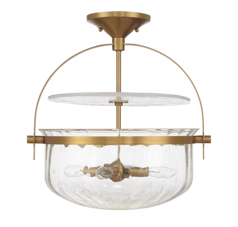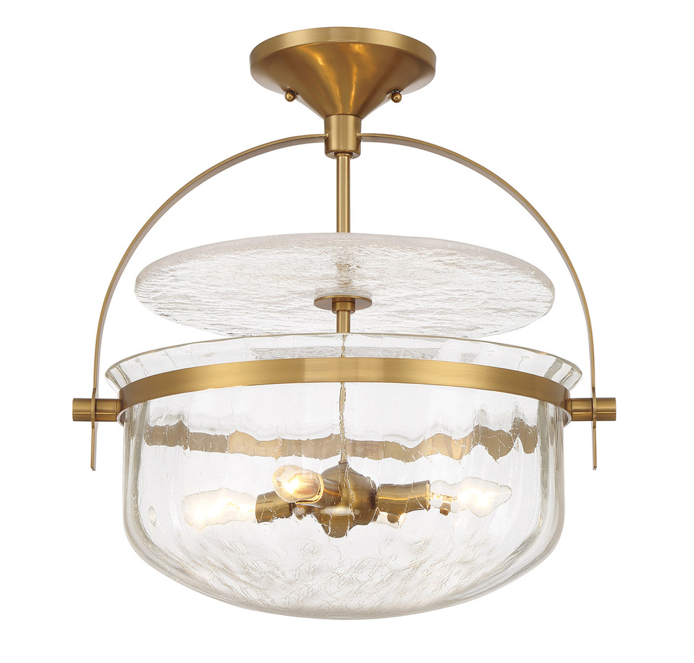 The Savoy House Denmar 4-light convertible semi-flush mount perfectly illuminates a wide variety of spaces with its classic style. It also has superior versatility because it can be used as a hanging pendant or ceiling light! The shade and diffuser of crackled glass bring eye-catching texture while the Warm Brass finish adds richness. Denmar is 18" in width and has an adjustable height ranging from 19" to 73". Comes with four 12" downrods and one 6" downrod. Uses four candelabra size bulbs of up to 60 watts per bulb. Bulbs not included.