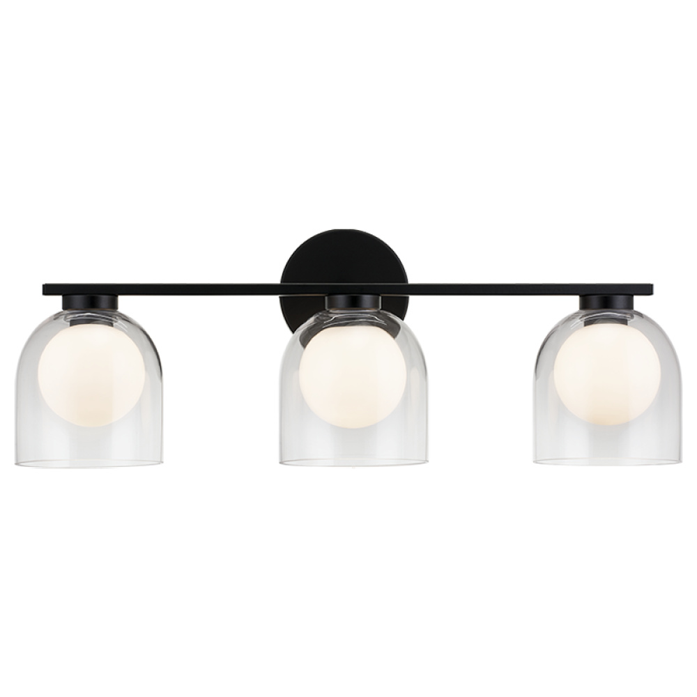Derbishone, a striking vanity series with graceful dome shaped clear glass. Available in 4 different sizes and 2 finishes: Aged Gold Brass or Black. Charming addition to room.