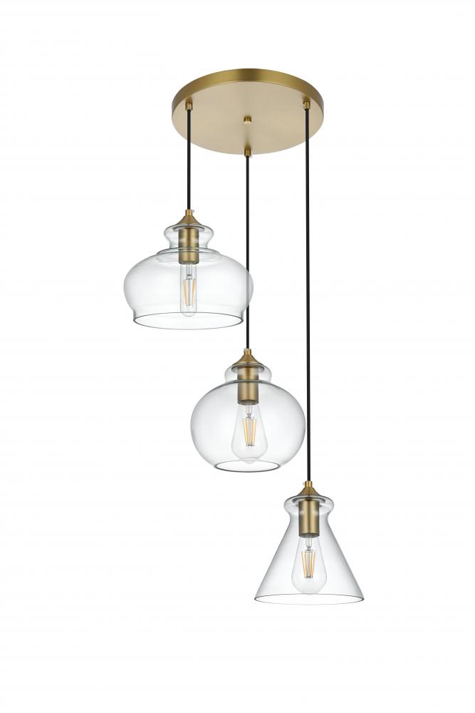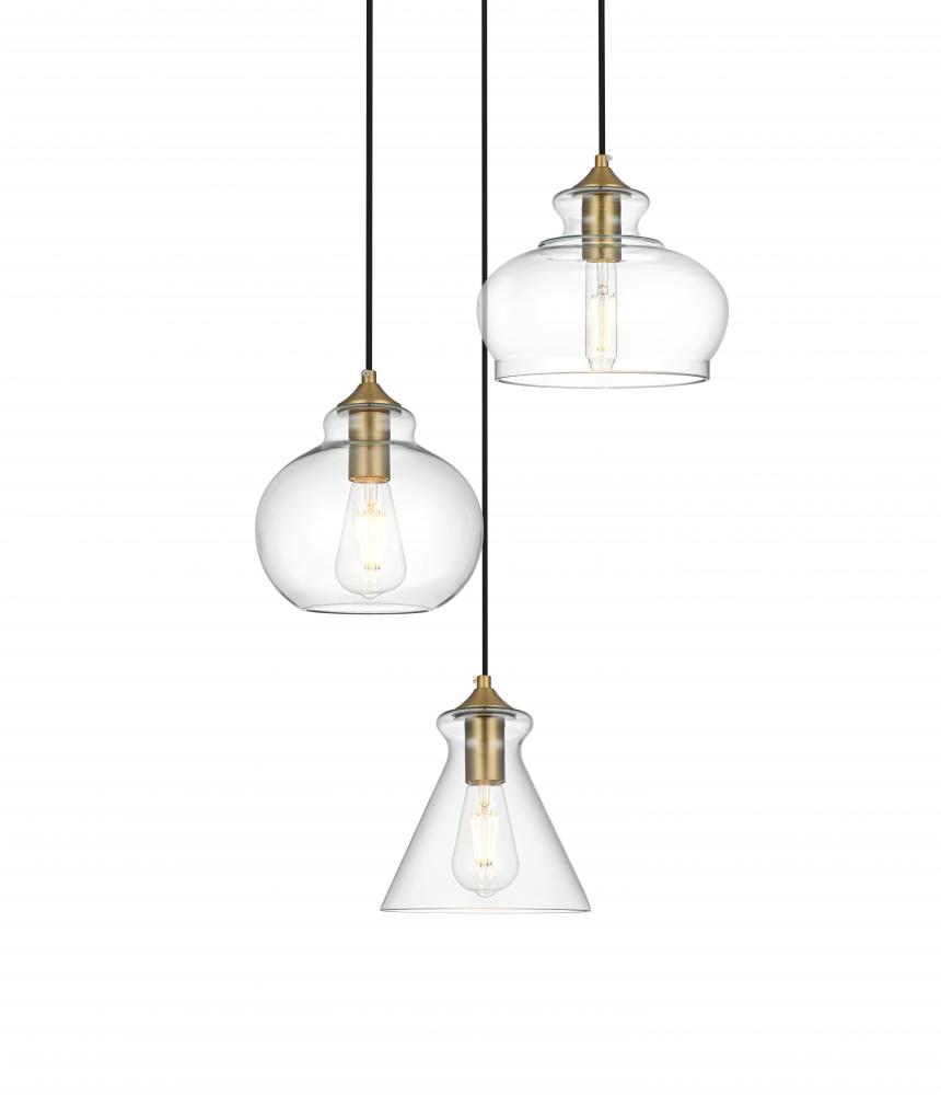 Enhance your space with this brilliant three-light hanging pendant that effortlessly combines timeless design with a modern twist. Featuring a stunning satin gold-finished round canopy, this pendant showcases three unique clear glass shades—each with a different silhouette, adding dynamic visual interest. The clean lines and transparent glass shades allow the warm glow of the filament bulbs (not included) to shine through, making this fixture ideal for kitchens, dining rooms, or any area that calls for a sophisticated touch. with its versatile charm and a mix of classic and contemporary styles, this pendant light is perfect for bringing a layer of refined elegance to your home.
