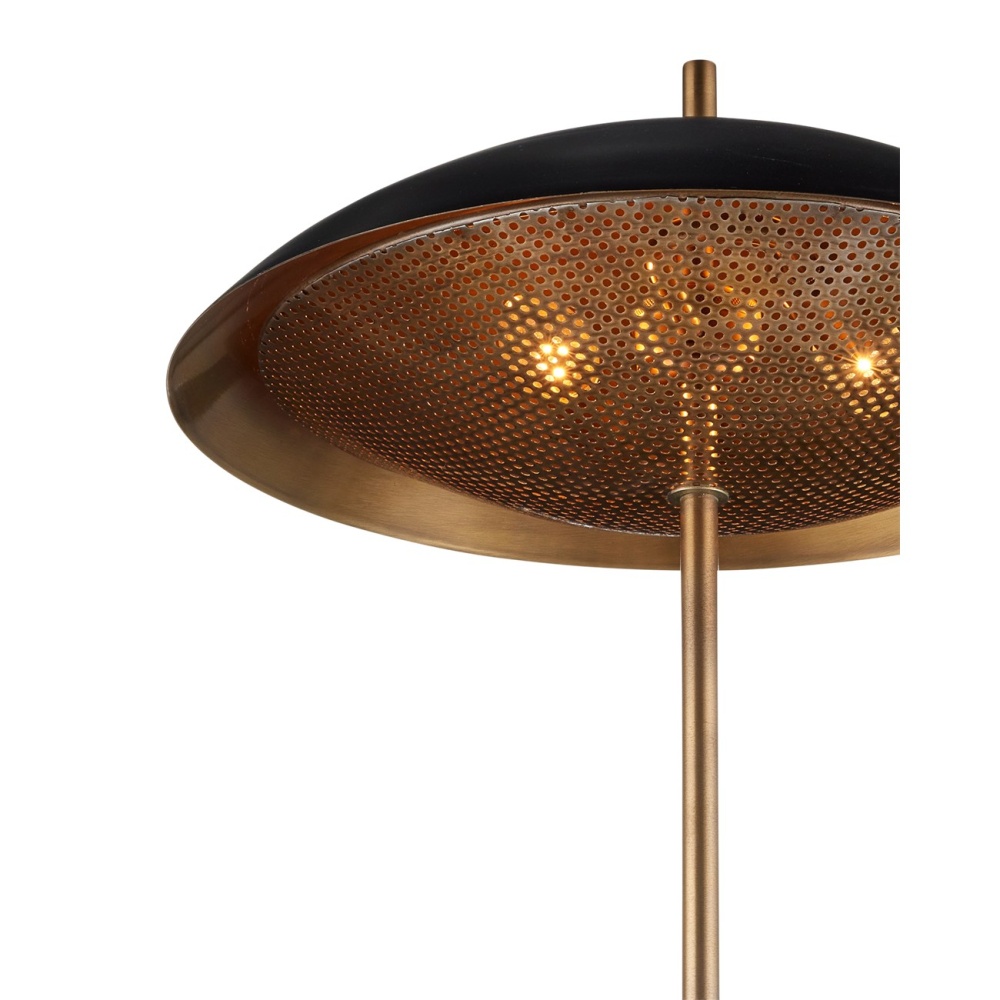 With its seriously handsome profile, the Domville Table Lamp is made of aluminum in an antique brass finish, capped off with a black metal shade. This lamp features a hexagonal hand-formed base and a punched-metal diffuser that adds a hint of texture as light wafts through it. A design detail of note is how the finial projects up through the domed shade as if it continues from the lamp's thin body.