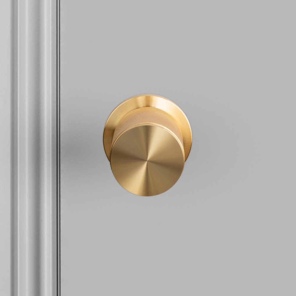 A door knob set, made from solid brass. This door knob features our signature, diamond-cut, cross-knurl pattern and is refined by hand. Sold as a pair.