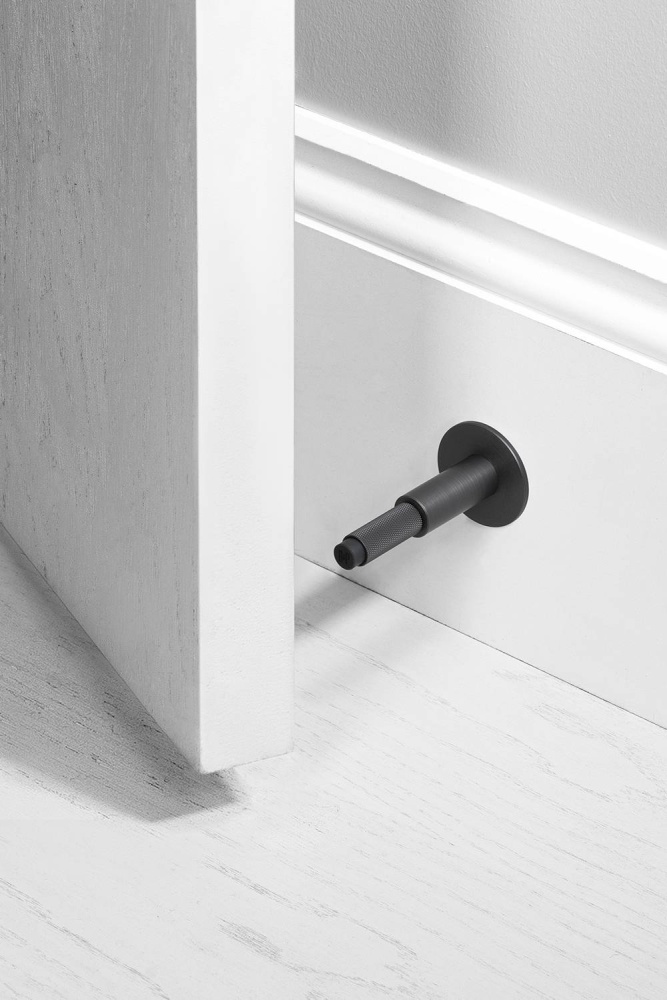 A wall-mounted door stop made from solid smoked bronze. This door stop features our signature, diamond-cut, cross-knurl pattern and black rubber buffer with ‘B+P’ logo debossed. Overall projection 96 mm / concealed fixing rose / heavy duty lease note: SMOKED BRONZE is a 'living finish'. This means, the more you use this smoked bronze product the more the base brass metal will show through. In short, this product will age beautifully with you.