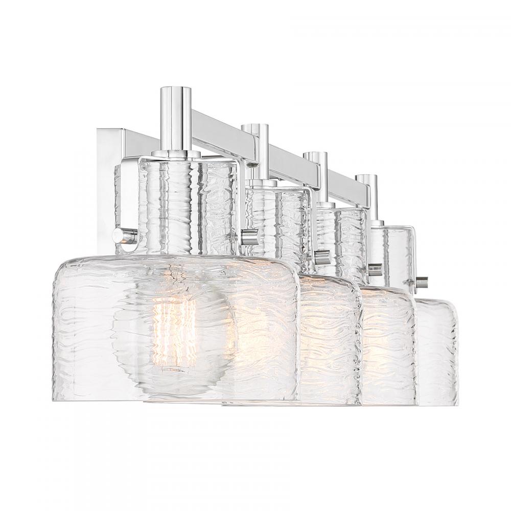 The Savoy House Dover 4-light bath light showcases standout bathroom lighting style! Clear glass shades feature a beautifully textured pattern that recalls ocean waves. These glass shades are held to the base by arms that are finished in Chrome and decorated with visible hardware to add a hint of vintage inspiration. Dover is 8.25" in height, 33.25" in width and extends 7.5" from the wall. It uses four standard size bulbs of up to 60 watts per bulb. Bulbs not included. Install as pictured. This bath bar is damp area rated.