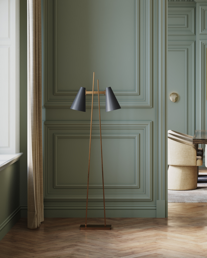 The Duet Floor Lamp has a pair of shades are aimed to give two readers the perfect amount of light when the lamp placed between two chairs. A design detail of note is the asymmetry of the two metal bars that rise up from the base, all in an antique brass finish. The contrasting fixed shades, in an oil-rubbed bronze finish, have white interiors for a brighter glow.